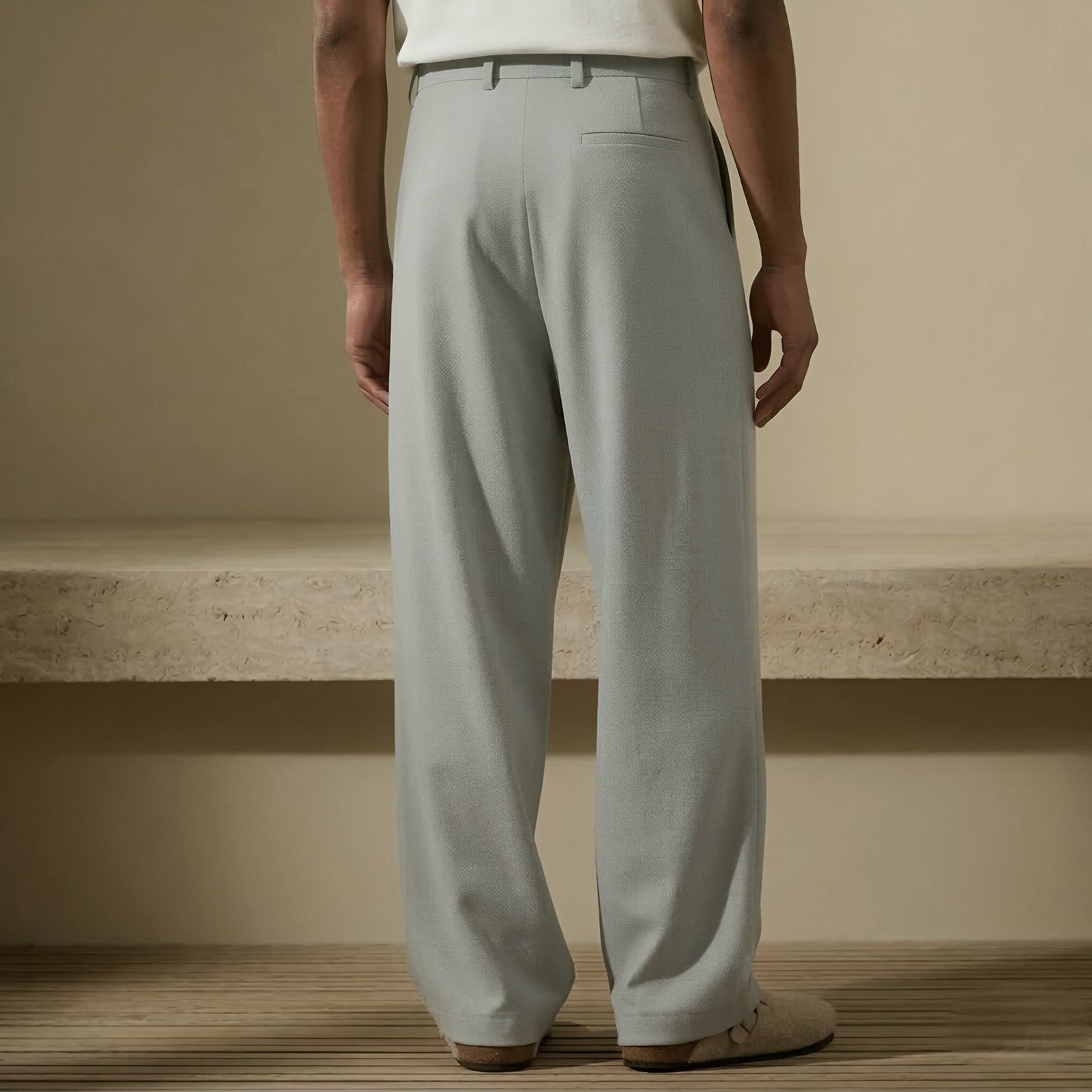 Crafted in a soft stone grey tone, these trousers pair seamlessly with knit polos, classic shirts, or tailored jackets for a polished yet relaxed look. The minimalist design and precise tailoring reflect a timeless approach to everyday dressing.